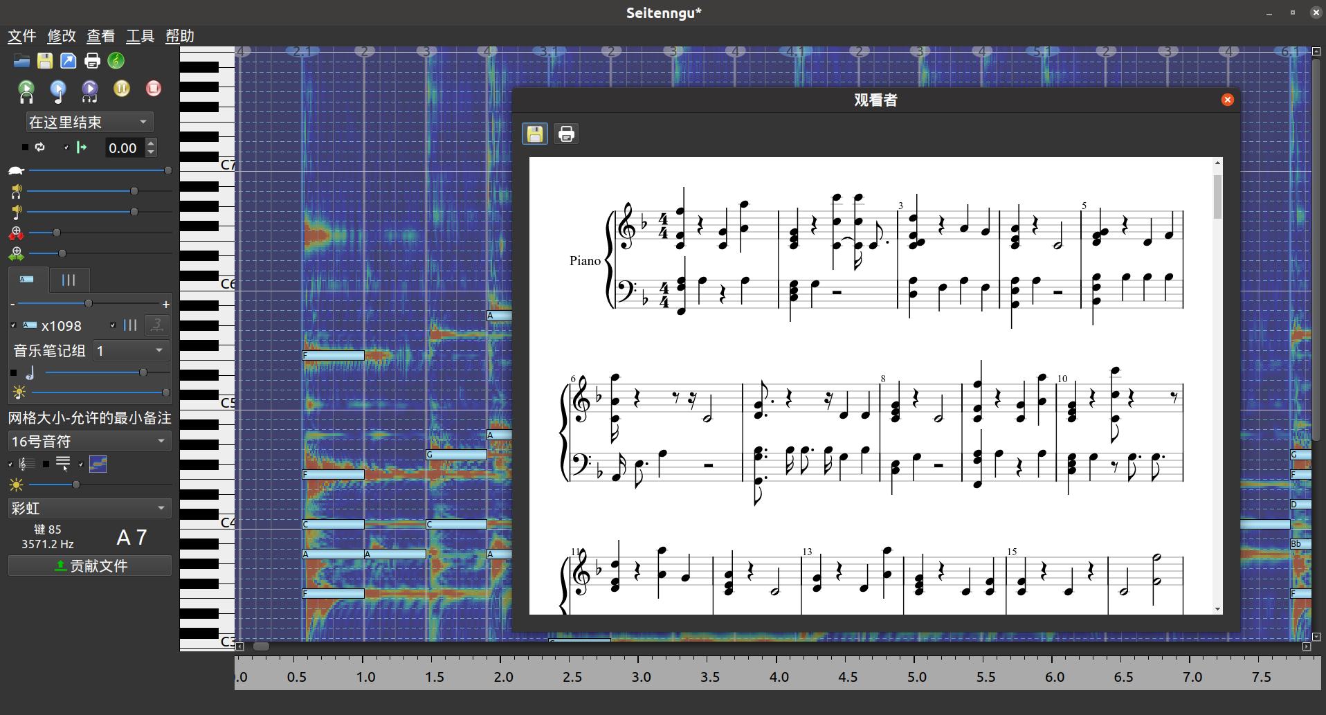有一个需要说明的微调选项是音符敏感度,太右边了会把一些没用的泛音列和杂音当成基音音符,太左边了又会遗漏音符。一般默认在中间就行。我不是很喜欢那个简陋的spectrum 音符调整界面。直接导出MusicXML格式后,换别的打谱软件调整就行。
